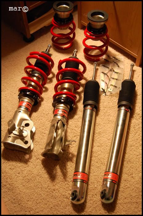 I got new suspension kit baby ;) Skunk 2 Pro S coilovers bitches. To bad I have to buy some stupid washers tomorrow morning because they gave me the old ones and then a spring compressor from marco. lol Bullshit but I love it!