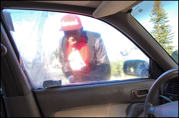 To the bank, we went. Heres a quick pic of Felix's scraper scrape. Window sealed, half taped, love hearted camry of his. Its a clean car, we tried to fix the window but some dude tried to jack Felix's deck hahah and the window was barely rolled down. People these days, doing anything they can to make money.