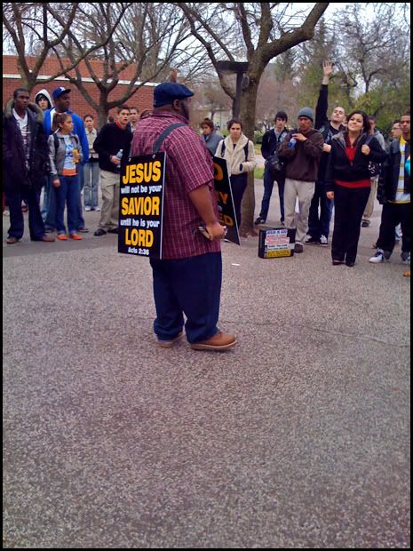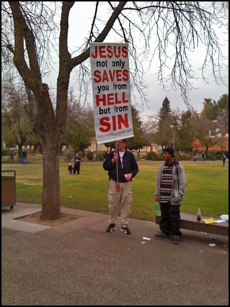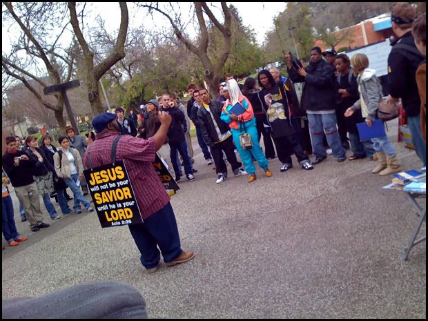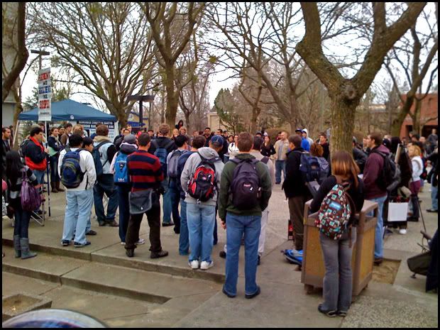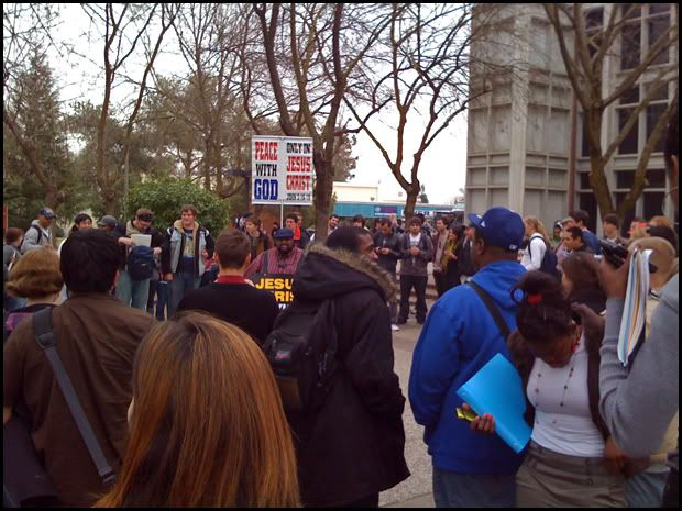 As I walk to my car, "look here a big crowd" ... the Second day of school and there's already controversial issues within the campus. Guess what the topic is ... RELIGION. Every semester there is usually some big arguement on peoples beliefs and faith. Two semesters ago, a group of individuals said some shit about the Muslim religion and all hell broke loose. People yelling at each other, fights, and also made KCRA News come out and recorded live on TV. I didn't really get a good idea about what they were talking about, but the pictures speak for themeselves. Everyone, race, gender, and religions were getting involved. Intense shit. It was pretty much this one dude yelling and screaming and everyone else yelling back at him. I was there for about 10 minutes and decided to go home. To much for me. Religion is one of this things where you just let it be. Keep it to yourself. That is it, or else stuff like this happens. Does this happen at your school? Probably not .. that is why ARC is sick. Oh ARC is short for American River Private Community College hahaha. Private my ass. I got all my classes! 4 at least I am still debating on if I should take a Friday class. Ill let you guys know. My school is better then your school!